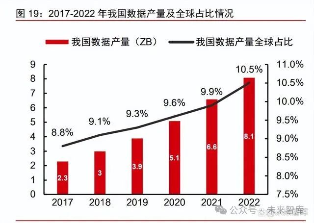 现在我国数据产量、数据经济规模位居全球第二。根据中国信通院,2022 年我国数 据产量达 8.1 ZB,同比增长 22.7%,占全球数据总产量 10.5%,位居世界第二;我国数 据存储量达724.5EB,同比增长 21.1%,占全球数据总存储量的 14.4%。2022 年我国 数字经济规模达50.2 万亿元,稳居世界第二。2023 年 2 月,中共中央、国务院印发《数 字中国建设整体布局规划》,其中提到“十四五”期间实现我国数字经济核心产业增加值 占 GDP 比重由 7.8%提升至 10%的目标。