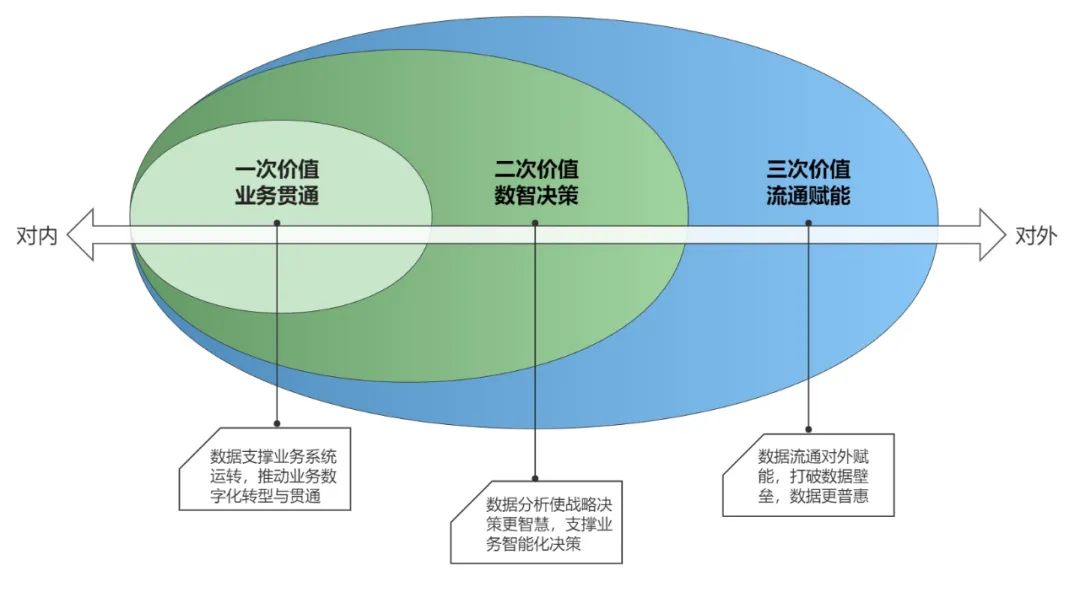 数据要素究竟如何发挥其作为生产要素的价值,需要进一步分析厘清。随着信息技术的开展和产业应用的演化,数据要素投入生产的途径可分为三次价值释放过程,即数据支撑业务贯通、数据有助于数智决策、数据流通对外赋能,如上图所示。需要注意的是,之所以说这三次价值是数据要素价值释放的三条途径,是因为一方面这三次价值之间存在一种递进关系,后者往往以前者为基础;另一方面,这三条途径存在一种并列关系,这些价值可以且有必要同时予以关注、同时充分释放。