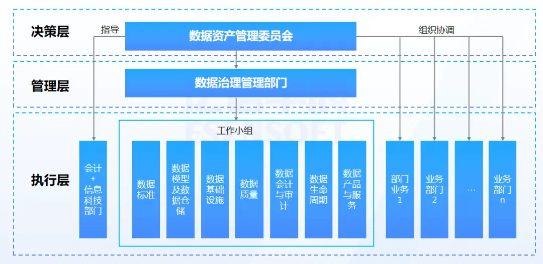 其次,在执行层面,应由财务和信息科技部门联合牵头,负责在数据项目中落实数据资产管理工作,并与数据资产管理委员会协同参与各项活动。同时,业务部门应给予辅助支持。各部门的职责、权利和义务都必须清晰明确,并明确指出数据资产管理是企业全员共同参与的工作。