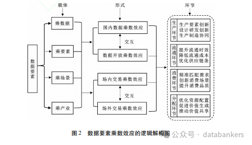 数据要素能够与数据、要素、场景、产业等载体发生乘数作用而呈现出效用的倍增。作为技术、资本、土地、劳动力等传统生产要素之外的新型生产要素,数据要素能够顺利获得自身作用表现出乘数效应,还能够与这些传统生产要素融合甚至驱动他们创新而发生乘数效应。数据要素在其流动中能够实现交易场所内的作用和交易场所外的作用,能有助于场内交易与场外交易的交互从而发生乘数效应,还能在国内发挥出数据乘数效应,并顺利获得跨境数据流通发挥出数据开放乘数作用。作为投入要素,数据要素能够作用于生产、流通、消费、分配等社会生产过程的各环节,进而实现价值的倍增。数据要素乘数效应的生成逻辑如图2所示。