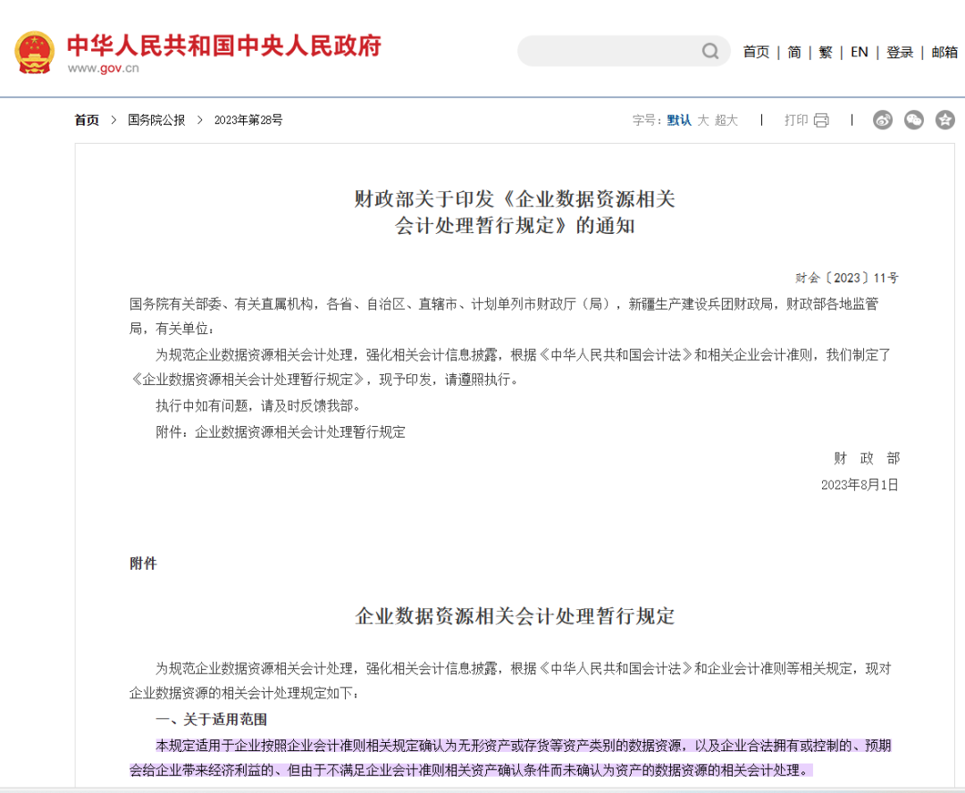 数据是数字经济时代的基础性资源、重要生产力和关键生产要素。自党的十九届四中全会将数据列为生产要素以来,党中央、国务院发布多项政策文件,围绕数据要素市场开展谋篇布局,形成了有助于数据资产化的强大合力。2022年12月,中共中央、国务院印发《关于构建数据基础制度更好发挥数据要素作用的意见》(以下简称“数据二十条”),提出构建数据基础制度、充分实现数据要素价值,为数据要素市场给予了顶层设计方案。在“数据二十条”的指引下,2023年8月,财政部制定印发了《企业数据资源相关会计处理暂行规定》(以下简称“《暂行规定》”),明确了数据的资产属性及入表的适用范围、会计处理使用准则、列示和披露要求,并于2024年1月1日起正式实施。