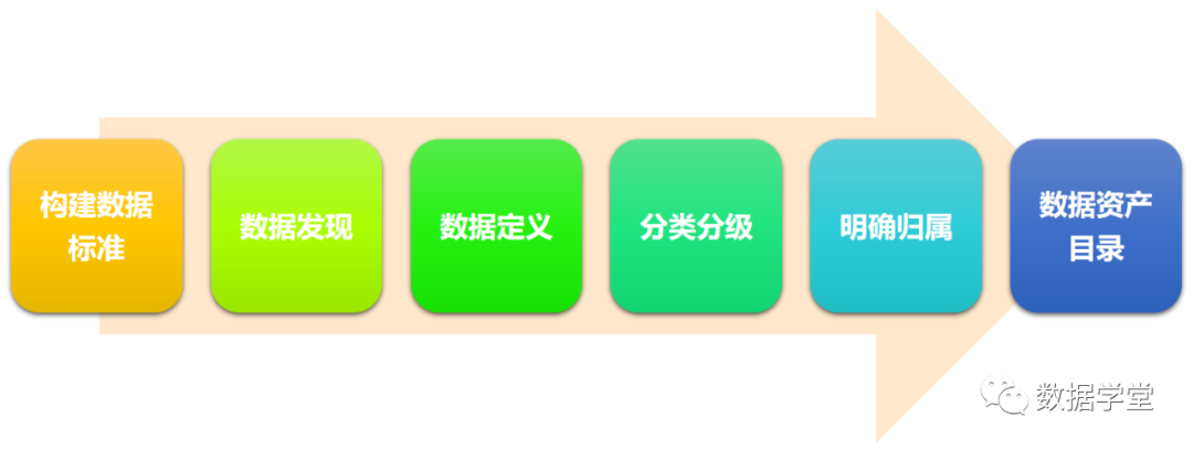 下面介绍数据资产盘点的方法和步骤,主要归纳为6个阶段:构建数据标准、数据发现、数据定义、分类分级、明确归属、数据资产目录。