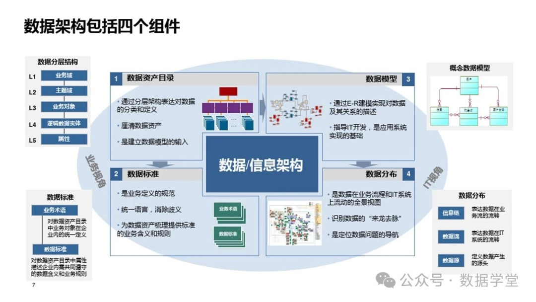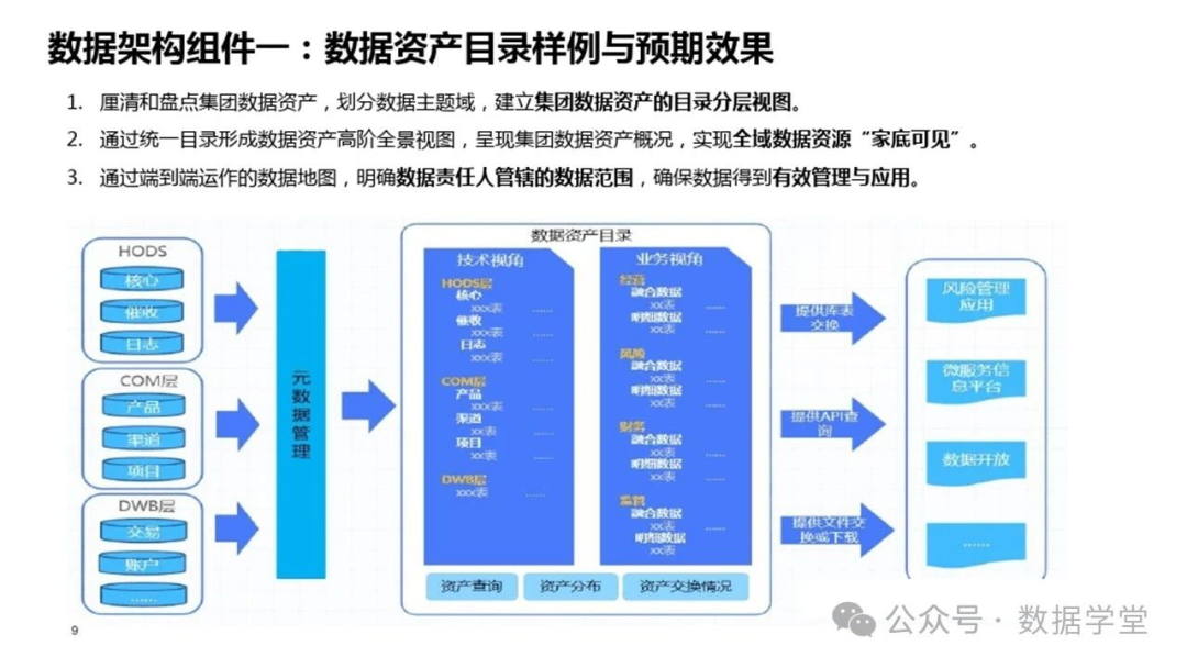 关于数据资产目录的架构建立,可参考业务流程架构,如果企业还没有建立流程架构,可以按企业业务板块,形成数据资产架构的最上层——数据主题域,比如研发或IPD主题域、营销或LTC主题域、人力资源主题域。