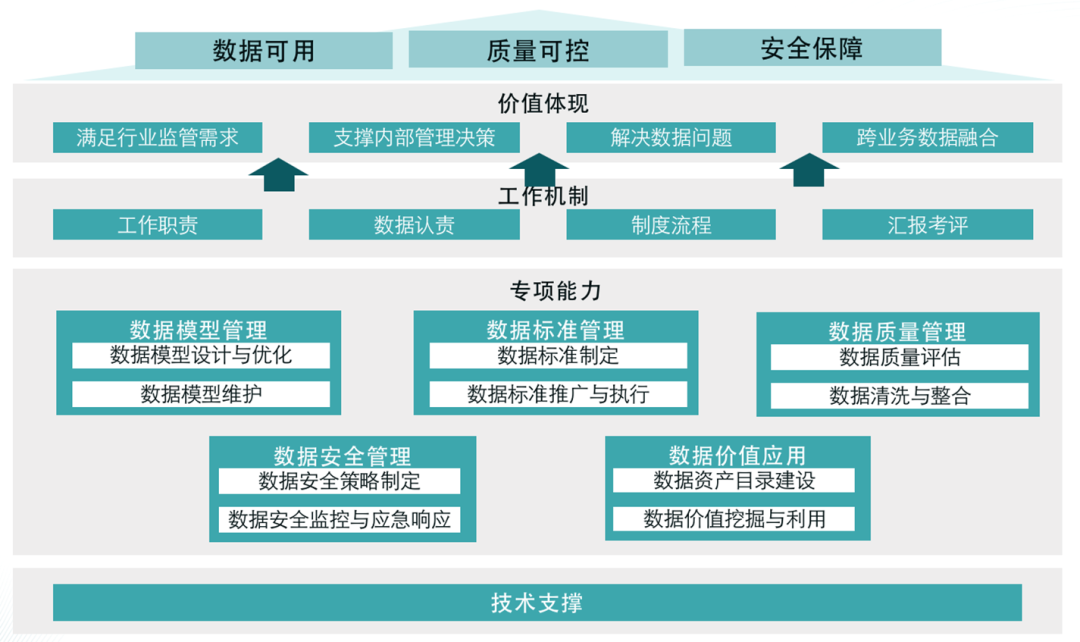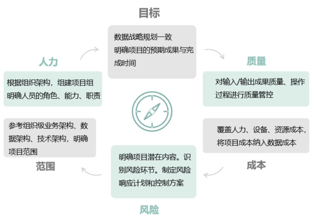 项目是执行组织级数据资产管理的最小单元,良好的数据资产项目管理是基础,参考IT项目管理框架,主要从目标一致性、角色合理性、范围明确性(包括业务范围、数据范围、技术范围等)、风险可控性、成本可计量、质量可优化等方面考虑。