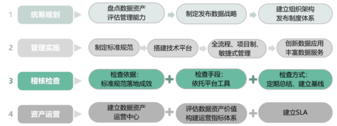 数据资产管理实践的通用步骤:“统筹规划→管理实施→稽核检查→资产运营”。但各步骤之间并无严格的先后顺序,组织可结合自身情况在各阶段制定合理的实施方案。