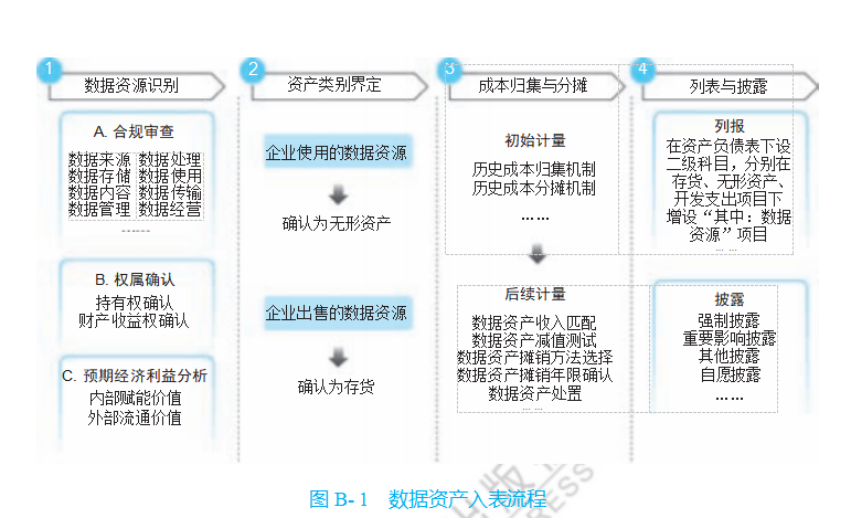 答:如图 B-1 所示,数据资产入表过程包括数据资源识别、资产类别界定、 成本归集与分摊、列报与披露等关键环节。在数据资源识别阶段,企业需严谨识别数据资源, 确保其符合资产定义, 评估其合规性、权属清晰度、可量化程度及未来经济利益潜力。在资产类别界定阶段,企业需根据数据资源的特征和使用方式,准确界定 其资产类别,将其准确归类为无形资产或存货。在成本归集与分摊阶段,对符合条件的数据资源进行精确的初始计量,全 面梳理直接和间接成本,并科学分摊。在列报与披露阶段,企业需遵循会计准则和法规要求,清晰、准确地在财 务报表中列报数据资源信息,并自愿披露更多相关信息。图 B- 1 数据资产入表流程