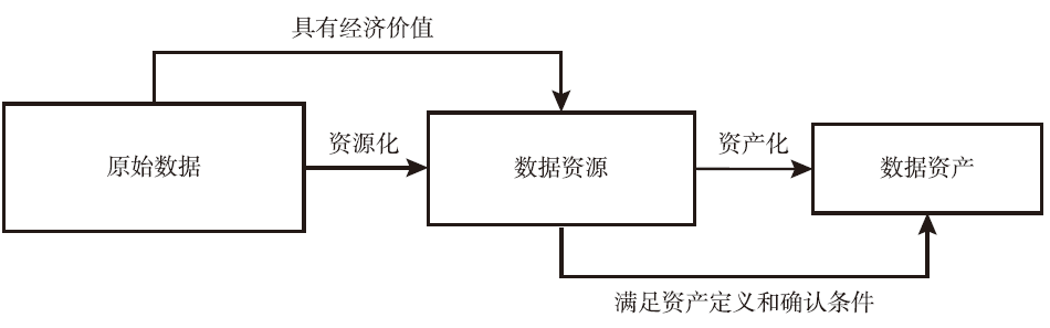 许宪春等认为数据的时效性决定了数据的使用寿命长短不一,如果数据的时效性不足一年,应被视为中间投入,故把数据资产定义为拥有应用场景且在生产过程中被反复或陆续在使用一年以上的数据。把数据资产界定为:以电子化形式存在,由过去事项形成,预期能为组织带来经济利益且该经济利益可用货币计量,由组织合法拥有或控制的现时非货币性数据资源。认为能够确认为数据资产的数据资源应该在过去的交易中形成,同时明确企业能够控制,且该数据资源具有带来未来经济利益的潜力。本文所说的数据是指以电子或其他方式记录下来的原始数据;数据资源是指把原始数据进行一定程度的加工处理以后,现在或者将来具备经济价值的数据;数据资产是指满足资产定义和确认条件,能进行货币计量,能入表的数据资源。三者的关系详见图2。