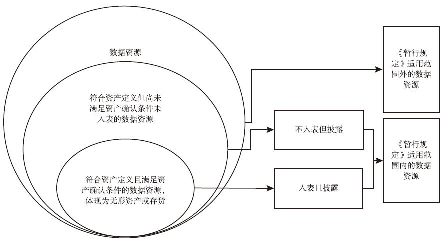 数据资源的分类可从多种维度进行,采取的分类标准和分类角度不同,分类的结果可能会有重合,但也会存在差异。根据数据权属不同,可以把数据资源分为三类,分别是企业数据资源,包括内部数据资源和外部数据资源;政府数据资源,包括政府业务和社情民情等多种公共数据;个人数据资源,包括个人用户自然生成的数据及其他多样化社交类数据。根据市场属性,数据资源又分为已市场化及未市场化的数据资源;基于数据来源,又可区分为交易性数据和自给性数据。本文依据《暂行规定》的适用范围,把数据资源分为两大类型,分别是《暂行规定》范围内和范围外的数据资源。其中,范围内的数据资源又包括企业按照企业会计准则相关规定确认为无形资产或存货等资产类别的数据资源,以及企业合法拥有或控制的、预期会给企业带来经济利益,但由于不满足企业会计准则相关资产确认条件而未确认为资产的数据资源,详见图3。
