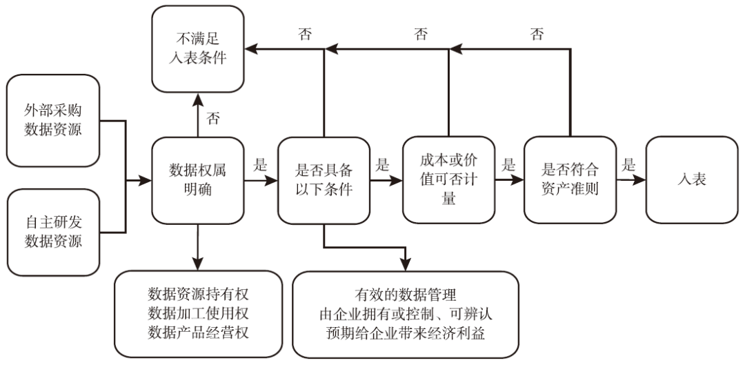数据资源确认3数据资源能否成功计入资产负债表,不仅要求数据资源本身权属清晰,还要求特定主体具备一定程度的数据管理能力。本部分第一时间明确数据资源的确权问题,然后梳理数据资源的有效管理问题,在此基础上判断一项数据资源是否满足入表条件,能否确认为数据资产。
