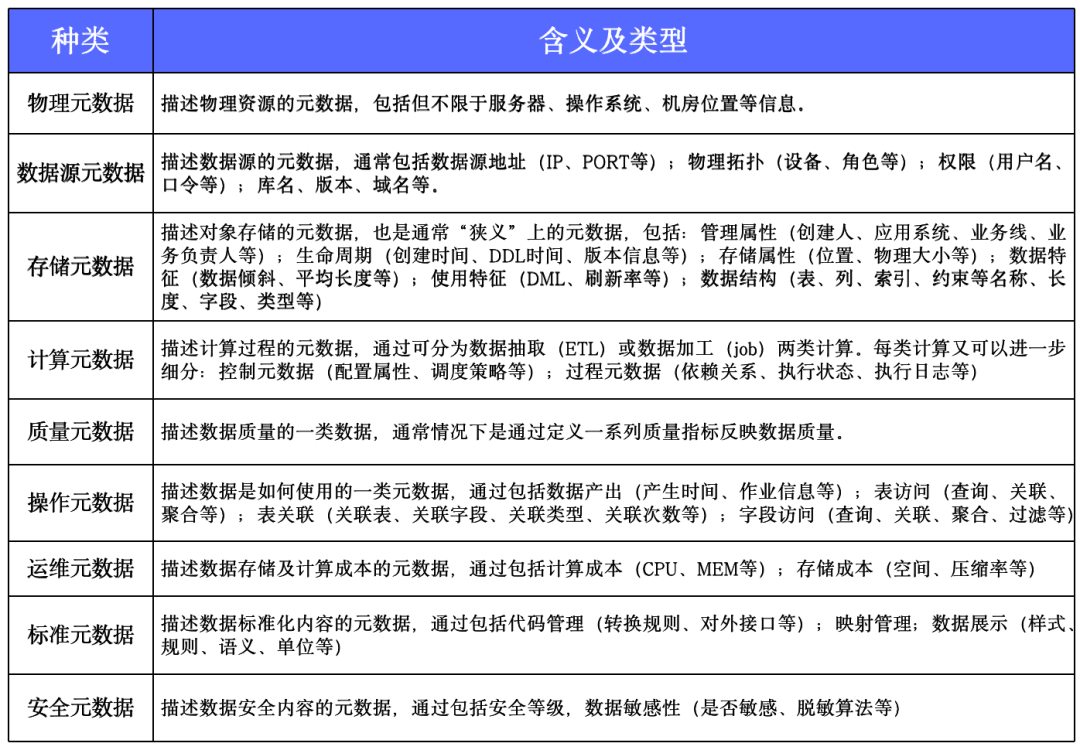 元数据不仅仅表示数据的类型、名称、值等信息,它可以理解为是一组用来描述数据的信息组/数据组,该信息组/数据组中的一切数据、信息,都描述/反映了某个数据的某方面特征,则该信息组/数据组可称为一个元数据。