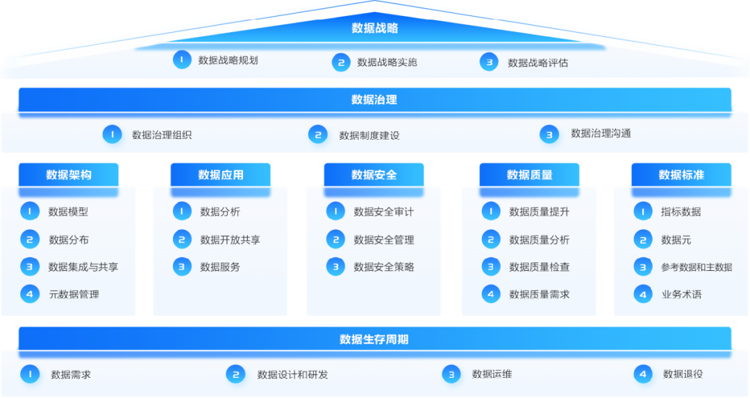 数据治理是DCMM数据管理框架的核心职能,是对数据资产管理行使权利和控制的活动集合,数治理涉及到数据管理的组织、标准规范、流程、架构等多个方面。数据管理的其他关键过程域都有交互,数据治理是在高层次上制定、执行数据管理的制度。数据治理能力域包括数据治理组织、数据制度建设、数据治理沟通三个能力项。