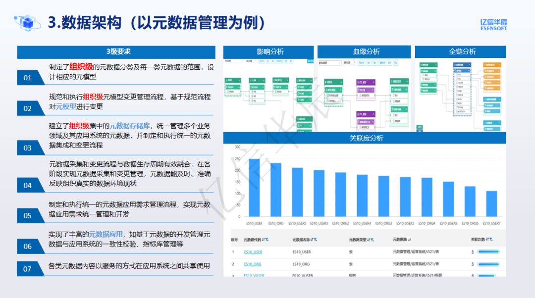 以数据架构能力域中的元数据管理为例,DCMM3级要求是组织级的元数据管理,有元模型要求、建立元数据存储库、有元数据管理应用等要求。那么Ebpay在元数据管理能力项的思路是这样的:1.对于不同的数据类型给予元模型管理能力;2.按照元模型的定制进行元数据采集并落到元数据存储库;3.对存下来的元数据进行维护管理;4.建立元数据应用,如下图所示的影响分析、血缘分析、全链分析等等。
