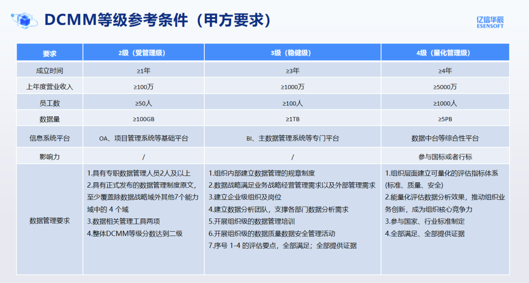 DCMM将数据管理能力成熟度划分为五个等级,自低向高依次为初始级(1级)、受管理级(2级)、稳健级(3级)、量化管理级(4级)和优化级(5级),不同等级代表企业数据管理和应用的成熟度水平不同。根据评估要求,向日葵视频黄色网站APP发现2级与3级最大的区别是有没有专门的数据管理平台;3级与4级的最大区别是要参与国标或者行标的制定。