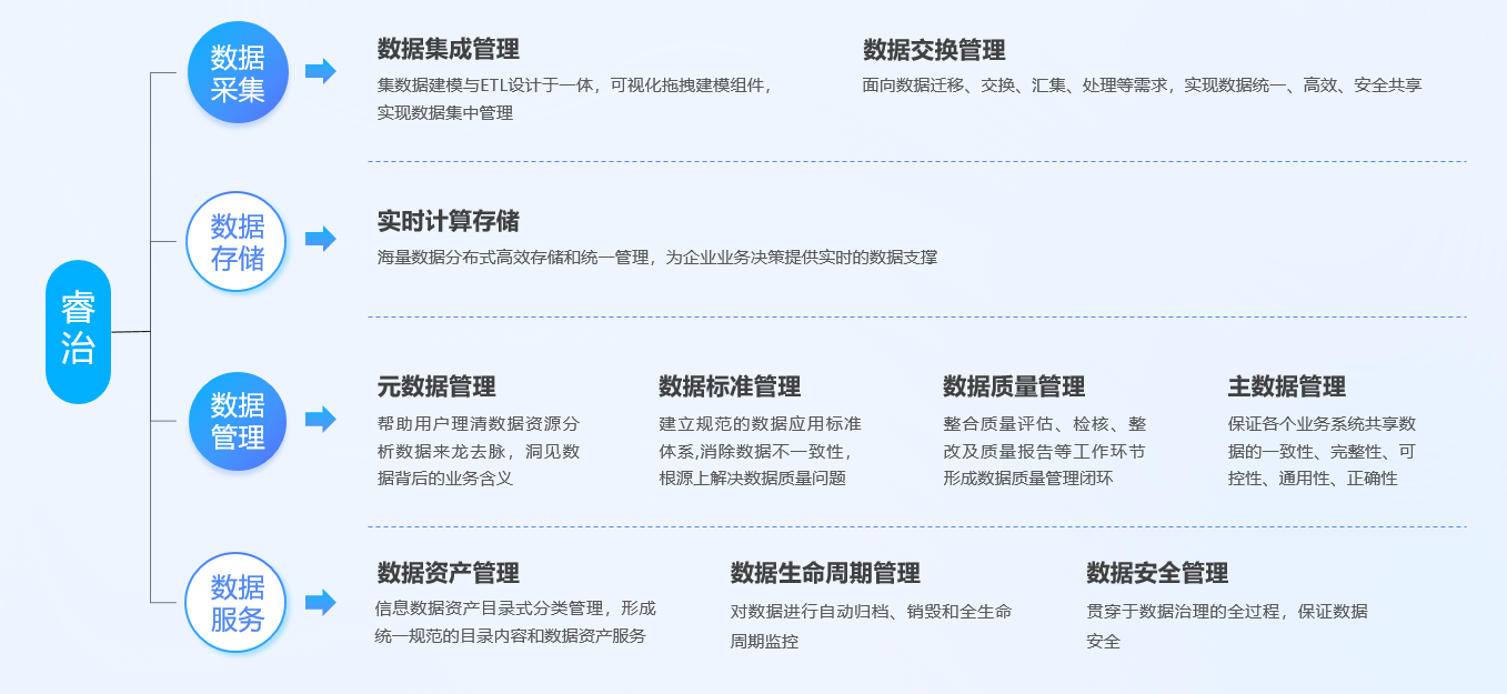 睿治智能数据治理平台并荣获DAMA中国数据治理优秀向日葵色版视频在线观看免费奖、星河奖优秀大数据向日葵色版视频在线观看免费奖等多个重磅奖项,形成包含数据交换、数据集成、主数据、实时数据计算、数据质量、数据标准、元数据、数据集成、数据资产、数据交换、数据安全和数据生命周期十大模块的数据治理向日葵色版视频在线观看免费方案,提升数据质量,助力数据标准落地,实现数据资产化。
