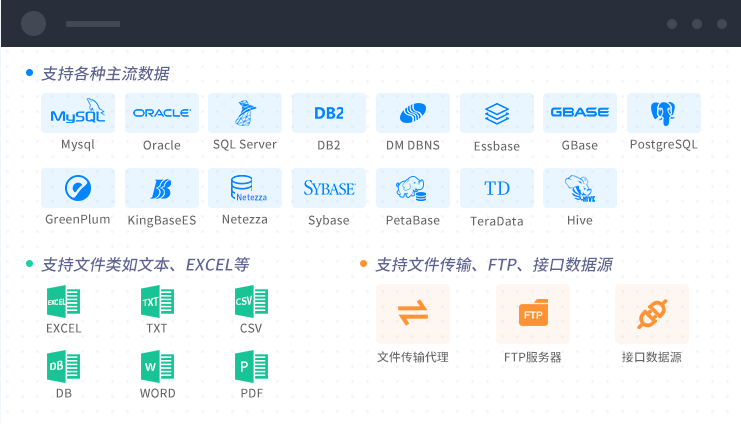 支持对数据传输交换节点进行可视化配置,监控节点的数据传输状态;支持各种主流数据库、文本文件、Excel文件、API接口、WebService服务等数据格式的传输,屏蔽各系统之间数据类型差异。