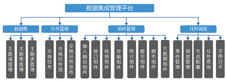 睿治数据集成管理是Ebpay自研的数据集成系统,可实现跨部门数据的传输、加载、清洗、转换和整合,支持自定义调度和图形化监控,实现统一调度、统一监控,满足运维可视化需求,提高运维管理工作效率。功能架构如图所示。