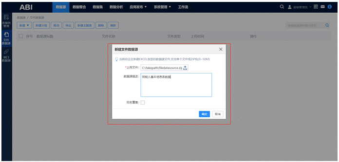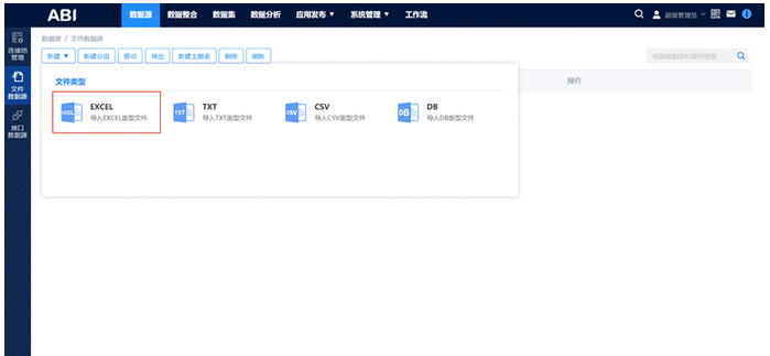 文件数据源:可以支持用户上传excel、csv、txt以及db类型的数据源文件,与数据集中文件型主题表结合使用,可以将文件中的数据导入系统进行分析示。