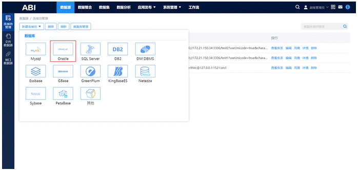 亿信ABI中的数据源模块可以连接Oracle、MySQL等很多种数据库,从这些数据库中收集数据。同时支持文件数据源和接口数据源: